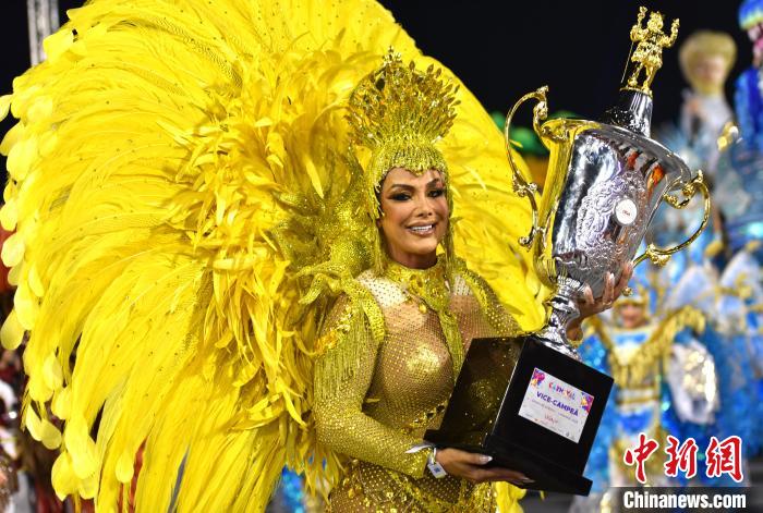 當?shù)貢r間2月17日晚間,巴西圣保羅狂歡節(jié)冠軍隊重返桑巴大道做收官游行演出。圖為一名桑巴舞校演員展示獎杯。記者林春茵攝