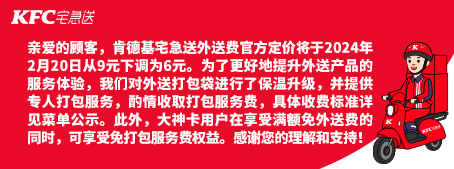肯德基官網顯示,肯德基宅急送外送費官方定價將于2024年2月20日從9元下調為6元。同時,肯德基稱,為了更好地提升外送產品的服務體驗,對外送打包袋進行了保溫升級,并提供專人打包服務,酌情收取打包服務費。此外,大神卡用戶在享受滿額免外送費的同時,可享受免打包服務費權益。