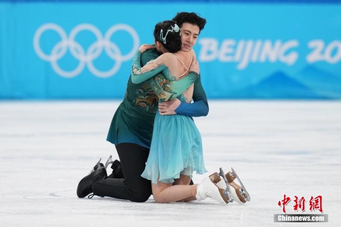 北京冬奧會(huì)花樣滑冰冰上舞蹈自由舞比賽賽后,王詩(shī)玥/柳鑫宇跪地相擁。(資料圖)中新社記者 崔楠 攝