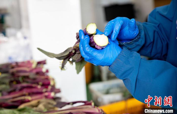 每天清早,趁露水未干,菜農(nóng)便穿梭于田壟間,長勢繁茂的菜薹如女子手腕粗細(xì),葉片紅得發(fā)紫。菜農(nóng)手握掐刀,瞄準(zhǔn)基部輕輕一掐,汁水四溢,拭塵土、扒外皮,即可生食。若是經(jīng)歷寒風(fēng)雪霜,更是甘甜。