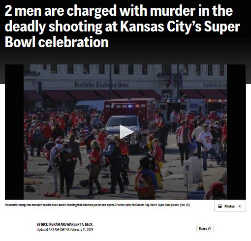 中新網(wǎng)2月21日電 據(jù)美聯(lián)社報(bào)道,當(dāng)?shù)貢r(shí)間20日,一份公開(kāi)的法庭文件顯示,美國(guó)堪薩斯城“超級(jí)碗”游行發(fā)生的槍擊事件中,兩名男子被控謀殺,報(bào)道稱“兩人在爭(zhēng)吵后不久掏出了槍并開(kāi)槍射擊”。