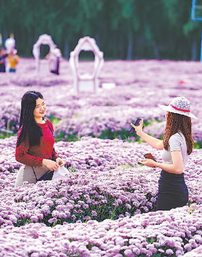 中國游客在泰國曼谷都會(huì)區(qū)的松樹天堂陽光公園拍照打卡。