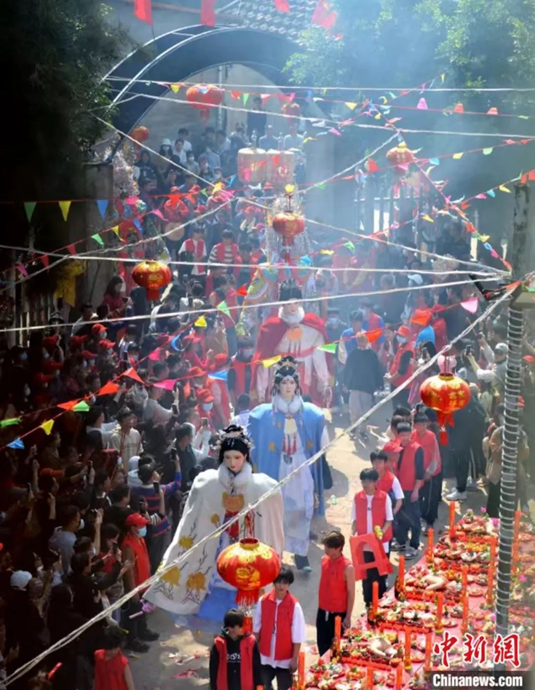 每年正月初十及正月二十六,潭頭鎮(zhèn)厚福村都會(huì)舉行傳統(tǒng)游神民俗活動(dòng),至今已有400多年的歷史。圖為傳統(tǒng)游神民俗活動(dòng)中的巡游隊(duì)伍簇?fù)碇ι駥⒌娜俗呓执?。中新社記?呂明 攝