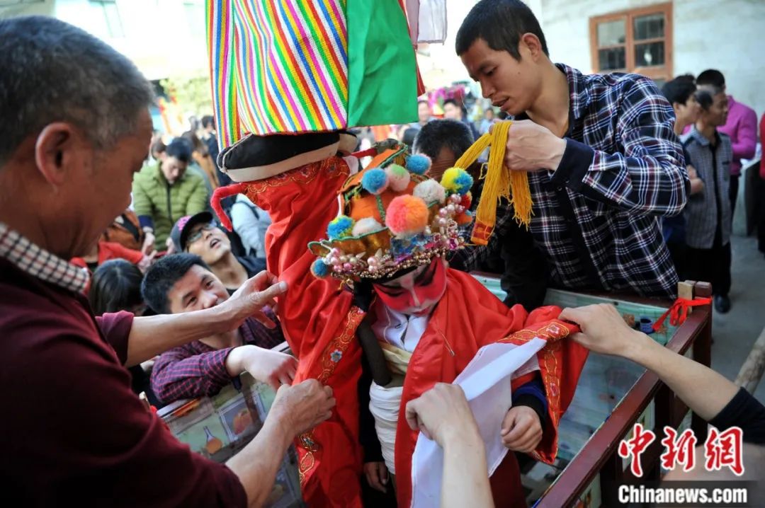 連城縣羅坊鄉(xiāng)舉行國(guó)家級(jí)非物質(zhì)文化遺產(chǎn),享有“中國(guó)客家狂歡節(jié)”美譽(yù)的“走古事”民俗活動(dòng)。圖為立于轎臺(tái)之上參加“走古事”的兒童。中新社記者 張斌 攝