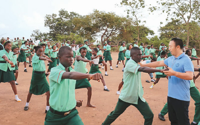 每周二上午,福拉灣學院附中全校齊上武術(shù)課,劉偉作為“總教頭”,一會兒在學生隊伍前演示“訓話”,一會兒在學生隊伍中一對一糾正動作。面對活潑好動的學生,劉偉也會不時請他的塞拉利昂徒弟“出山”,作為課堂的“左右護法”。