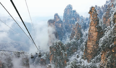冰雪云霧間的湖南張家界國家森林公園天子山。