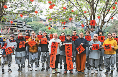 春節(jié)期間,廣西壯族自治區(qū)桂林市靈川縣九屋鎮(zhèn)西嶺山莊迎來一批外國(guó)客人,他們一起寫福字、磨豆腐、舂糍粑、釀圓子……沉浸式體驗(yàn)中國(guó)傳統(tǒng)民俗,現(xiàn)場(chǎng)歡聲笑語不斷。