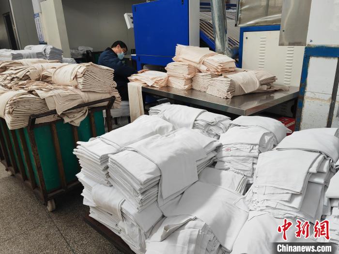 臥具從工業(yè)洗衣機(jī)里撈出后,就進(jìn)入烘干、消毒、熨燙工序,從進(jìn)入烘干機(jī)到再從熨燙機(jī)出來,只需10秒,原本滴水的臥具就變得干燥平展。這對負(fù)責(zé)折疊、打包的洗滌工手速有著極高的要求。