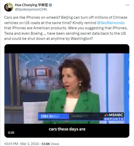 3月3日,華春瑩在社交媒體上發(fā)文回應(yīng)美方這番言論,“汽車就像是裝了輪子的iPhone(蘋果手機(jī))?北京能讓美國(guó)道路上的數(shù)百萬(wàn)中國(guó)汽車同時(shí)熄火?友好提醒一下,iPhone是美國(guó)產(chǎn)品。你是不是在暗示iPhone、特斯拉甚至波音……一直在將機(jī)密數(shù)據(jù)傳送回美國(guó),隨時(shí)可能被華盛頓關(guān)停?”