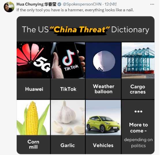 華春瑩最后回?fù)?,“如果你唯一的工具是錘子,那么所有東西看起來都像釘子?!边@條帖文隨附圖片上,列出美國以往炒作“中國威脅”的詞典:包括華為,TikTok,氣象無人飛艇,起重機(jī),玉米加工廠,大蒜,汽車……還有更多,取決于政治因素。↓