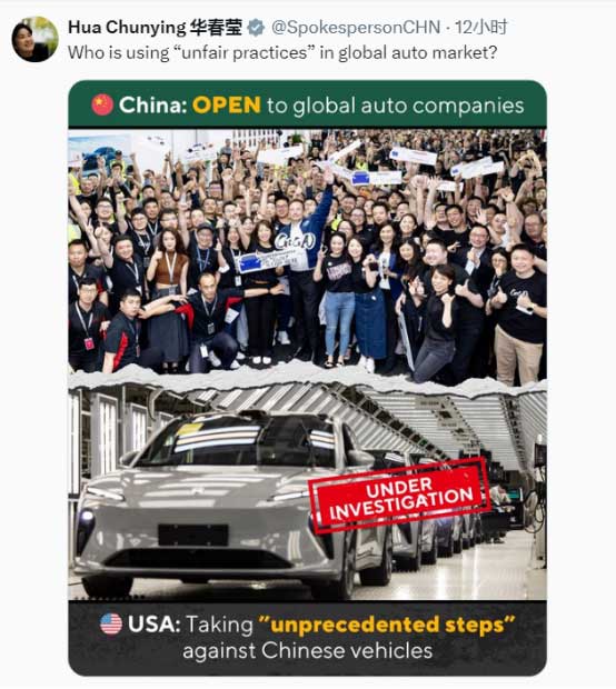 她隨后發(fā)表圖文,對(duì)比中美在汽車行業(yè)的行為問道,“是誰在全球汽車市場(chǎng)采取‘不公平做法’?”圖片顯示,中國的做法是“向全球車企”開放,而美國正針對(duì)中國汽車采取“前所未有的措施”?!?/p>