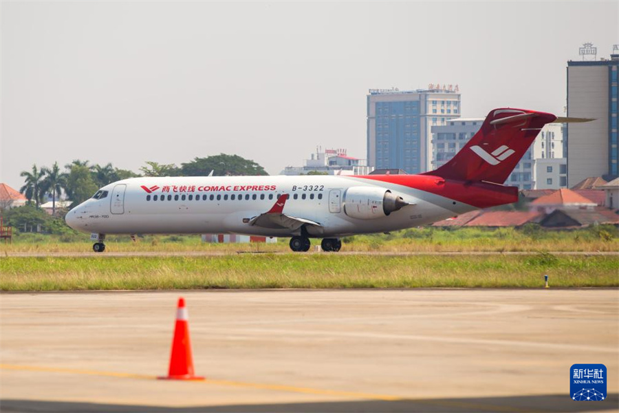 這是3月4日在老撾萬(wàn)象瓦岱國(guó)際機(jī)場(chǎng)拍攝的ARJ21飛機(jī)。新華社發(fā)(凱喬攝)