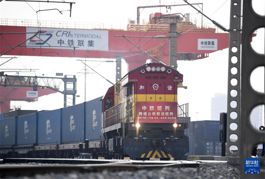 3月7日,中歐班列(越南·河內(nèi)——中國(guó)·西安——匈牙利·布達(dá)佩斯)跨境公鐵聯(lián)運(yùn)班列從西安國(guó)際港站駛出。新華社記者 李一博 攝