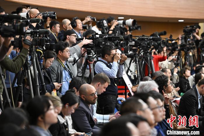 3月6日,十四屆全國人大二次會議在北京舉行記者會,國家發(fā)展和改革委員會主任鄭柵潔、財政部部長藍佛安、商務(wù)部部長王文濤、中國人民銀行行長潘功勝、中國證券監(jiān)督管理委員會主席吳清就發(fā)展改革、財政預(yù)算、商務(wù)、金融證券等相關(guān)問題回答中外記者提問。圖為中外記者在現(xiàn)場采訪?!≈行律缬浾?何蓬磊 攝