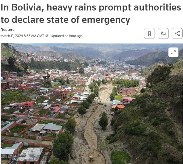據(jù)此前報道,自3月開始,拉巴斯遭遇持續(xù)降雨,山體滑坡、洪水、泥石流等自然災害多發(fā)。官方數(shù)據(jù)顯示,自1月雨季開始以來,玻利維亞全國各地已有近50人死于洪水。