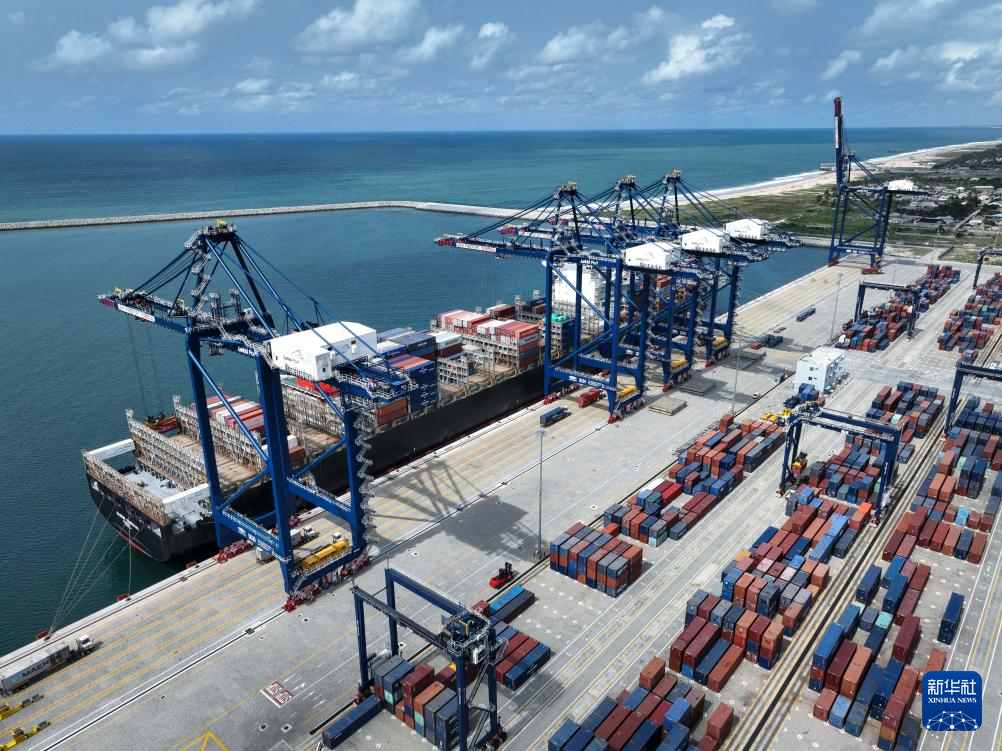 3月11日,一艘貨輪在尼日利亞拉各斯萊基深水港裝卸集裝箱(無人機(jī)照片)。新華社發(fā)(萊基港公司供圖)