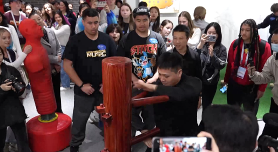 詠春拳木人樁、梅花樁、長矛等武術(shù)表演,引來代表團(tuán)中的學(xué)生們踴躍體驗(yàn)。