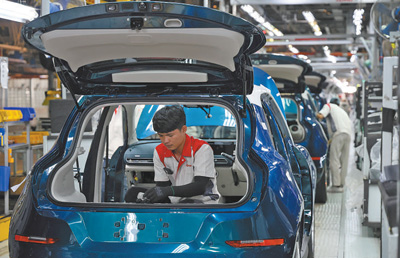 今年1月,中國車企長城汽車旗下電動汽車歐拉好貓在泰國羅勇新能源汽車制造基地正式下線,成為泰國首款本土量產(chǎn)的純電車型,將加速泰國汽車行業(yè)電氣化轉(zhuǎn)型。圖為該制造基地的生產(chǎn)車間內(nèi),工人在進行汽車裝配作業(yè)。