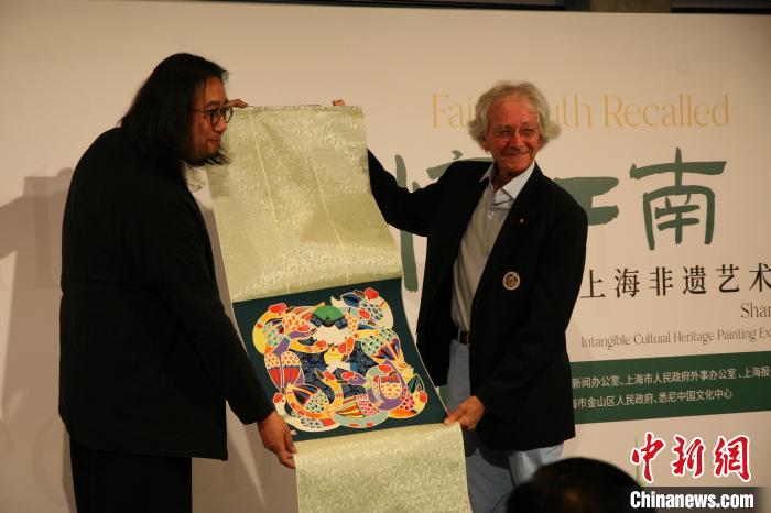 當(dāng)?shù)貢r(shí)間4月2日,“魅力上海”系列《憶江南——上海非遺藝術(shù)展(悉尼站)》在悉尼歌劇院正式開(kāi)幕。圖為“80后”農(nóng)民畫(huà)家李元(左)向澳大利亞水彩畫(huà)協(xié)會(huì)主席大衛(wèi)·范·紐恩(右)贈(zèng)送了農(nóng)民畫(huà)作品《花鵝》。中新社記者 顧時(shí)宏 攝