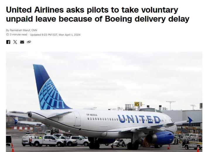 據(jù)美國消費者新聞與商業(yè)頻道(CNBC)報道,美聯(lián)航證實了無薪休假的請求。該航空公司此前還表示,由于波音公司的飛機延遲交付,它將在2024年春天暫停招聘飛行員。