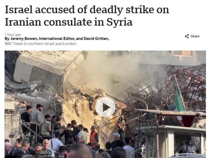 報道援引伊朗駐敘利亞大使侯賽因·阿克巴里的話稱,伊朗大使館旁邊的領(lǐng)事部門建筑“遭到以色列F-35戰(zhàn)機發(fā)射的六枚導(dǎo)彈襲擊”。伊朗媒體發(fā)布的視頻還顯示,現(xiàn)場遭到嚴重破壞,并起火冒煙。