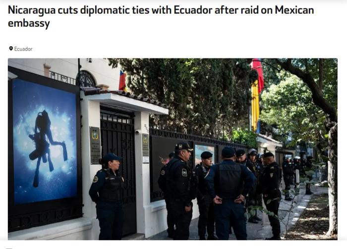 報(bào)道介紹,5日晚,厄安全部隊(duì)駕駛裝甲車進(jìn)入墨西哥駐厄使館,逮捕身處使館的厄瓜多爾前副總統(tǒng)豪爾赫·格拉斯。厄總統(tǒng)府發(fā)布公告稱,安全部隊(duì)已逮捕格拉斯。墨西哥外交部長巴爾塞納隨后宣布,鑒于厄方公然違反《維也納外交關(guān)系公約》及墨西哥駐厄外交人員所受傷害,墨西哥立即斷絕與厄瓜多爾的外交關(guān)系。