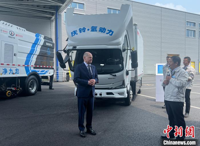 博世氫動(dòng)力系統(tǒng)(重慶)有限公司是朔爾茨訪(fǎng)渝首站參觀地。該公司由博世與慶鈴汽車(chē)合資建立,致力于將博世氫燃料電池解決方案引入中國(guó)市場(chǎng)。在參訪(fǎng)點(diǎn)入口,四輛冷鏈物流、環(huán)衛(wèi)及牽引車(chē)等依次停放。這些車(chē)全為中國(guó)國(guó)產(chǎn)汽車(chē),使用博世氫動(dòng)力系統(tǒng)(重慶)有限公司出產(chǎn)的氫動(dòng)力模塊。朔爾茨在企業(yè)相關(guān)負(fù)責(zé)人的介紹下,了解博世與中企合作的最新成果。在工作人員指引下,朔爾茨為完成預(yù)裝的氫動(dòng)力模塊拴緊最后一顆螺絲,向身邊工作人員豎起了大拇指。