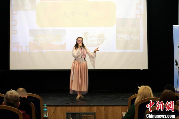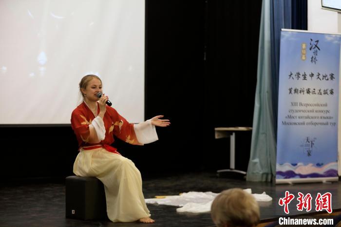 4月12日,第十三屆全俄“漢語橋”大學(xué)生中文比賽莫斯科賽區(qū)選拔賽在莫斯科國立語言大學(xué)舉行。圖為參賽選手進(jìn)行主題演講。(中新網(wǎng)記者 田冰 攝)