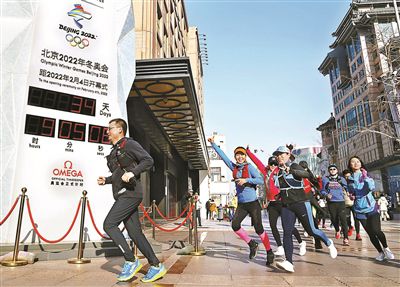 昨天,在位于王府井百貨大樓前的北京2022冬奧會倒計(jì)時(shí)牌前,除了拍照外,市民還通過各種“個(gè)性打卡”方式慶祝新年的到來。圖為前來“打卡”的清華MBA健跑俱樂部的隊(duì)友們從倒計(jì)時(shí)牌前跑過。