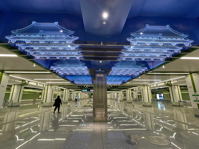 在車站裝修方面,地鐵19號線車站在裝修設(shè)計中突出“薈萃京華”的總體設(shè)計概念,在車站風(fēng)格中體現(xiàn)北京傳統(tǒng)與現(xiàn)代精華,全線站廳通道口、換乘通道及站臺樓扶梯三角房處以突出導(dǎo)向性和識別性為原則進行重點裝修。以“鳳凰于飛—鳳祥燈會”為設(shè)計主題的新發(fā)地站、繪有“雙鯉戲水”的積水潭站、加入牡丹和景泰藍(lán)元素的牡丹園站……乘客可在各站感受到多元化的“地鐵藝術(shù)”。