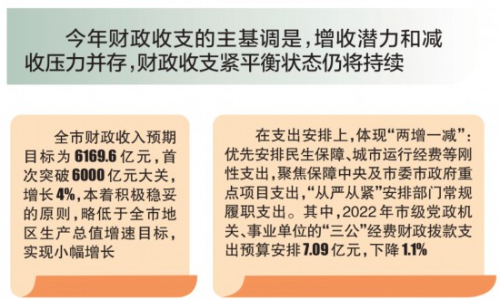在財(cái)政收支依然嚴(yán)峻的情況下,“緊平衡”態(tài)勢(shì)也呈現(xiàn)出與以往財(cái)政收入零增長(zhǎng)、負(fù)增長(zhǎng)不同的態(tài)勢(shì)。吳素芳介紹,2022年的“緊平衡”,主要體現(xiàn)為收入回歸常態(tài)運(yùn)行,但各領(lǐng)域資金需求快速增長(zhǎng)。財(cái)政部門要堅(jiān)決貫徹落實(shí)中央經(jīng)濟(jì)工作會(huì)提出的“積極的財(cái)政政策要提升效能,更加注重精準(zhǔn)、可持續(xù)”工作要求,通過調(diào)結(jié)構(gòu)、盤存量、抓統(tǒng)籌、保重點(diǎn)等方式做好保障。在支出安排上,體現(xiàn)“兩增一減”:優(yōu)先安排民生保障、城市運(yùn)行經(jīng)費(fèi)等剛性支出,聚焦保障中央及市委市政府重點(diǎn)項(xiàng)目支出,“從嚴(yán)從緊”安排部門常規(guī)履職支出。其中,2022年市級(jí)黨政機(jī)關(guān)、事業(yè)單位的“三公”經(jīng)費(fèi)財(cái)政撥款支出預(yù)算安排7.09億元,下降1.1%。
