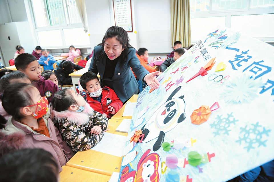 1月6日,太原市第二實(shí)驗(yàn)小學(xué),孩子們?cè)谂c老師的互動(dòng)中學(xué)習(xí)知識(shí)。該校積極響應(yīng)“雙減”政策,為一、二年級(jí)學(xué)生開展“巧娃迎冬奧”等主題綜合素質(zhì)大比拼,讓孩子們?cè)趧?dòng)手、動(dòng)腦、小組合作中輕松快樂地開展自主、合作、探究性學(xué)習(xí)。(記者阮洋攝)