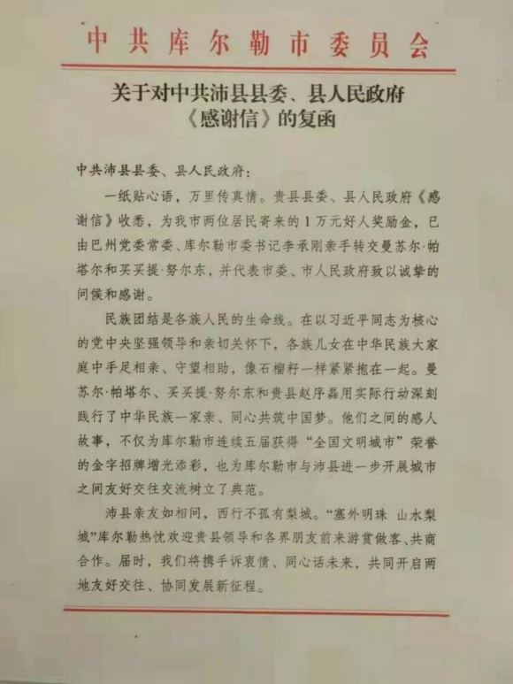 沛縣縣委、縣政府獲悉此事后十分重視,1月2日,以沛縣縣委、縣政府的名義,給新疆維吾爾自治區(qū)庫爾勒市委、市政府發(fā)去了一封感謝信,并從沛縣“好人基金”中拿出1萬元獎金,請庫爾勒市委、市政府轉交給曼蘇爾·帕塔爾和買買提·努爾東兩人,以獎勵二人的善行之舉,這才有了本文開頭庫爾勒市給沛縣回應“感謝信”復函那一幕。