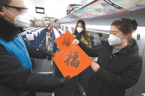 昨天5時34分,北京地區(qū)首趟春運高鐵G6737次列車發(fā)車,列車員將精心準(zhǔn)備的福字送給旅客。本報記者 安旭東攝
