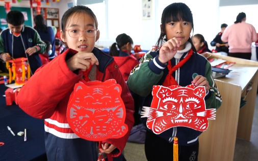 除了無骨花燈,學生們還發(fā)揮想象力和創(chuàng)造力,將繪畫、剪紙技藝融入花燈制作,制作出不少各具特色的童趣花燈。學生王鑫拿著自己制作的花燈說:“花燈上面有小老虎,很適合虎年,而且它很漂亮很可愛。”