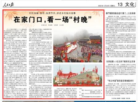 1月25日至26日,農(nóng)歷小年之際,國家公共文化云推出“村晚”接力云展播,集中展示《我的“村晚”我的年》融媒體節(jié)目,以及來自內(nèi)蒙古、黑龍江、上海等20個?。▍^(qū)、市)的30場精彩“村晚”活動。節(jié)目通過文化傳承、時代新風、展望未來3個篇章,以訪談、互動、游戲等方式,展播各地特色“村晚”節(jié)目、分享“村晚”臺前幕后故事、展現(xiàn)鄉(xiāng)村振興美好畫卷、推介鄉(xiāng)村美景好物。