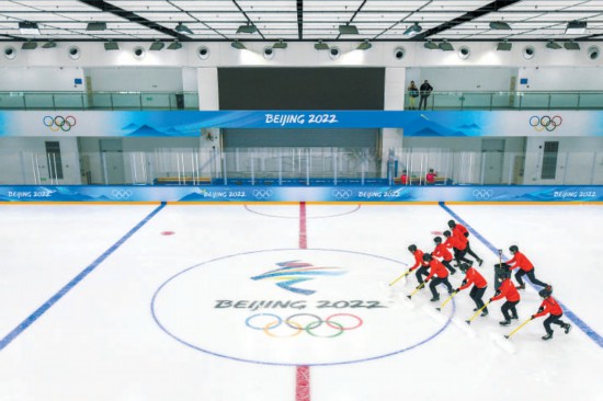 昨天上午,在冬奧冰球項目場地國家體育館訓(xùn)練場,清雪服務(wù)人員“雪童”練習(xí)快速清雪,準(zhǔn)備迎接比賽到來。 本報記者 鄧偉攝