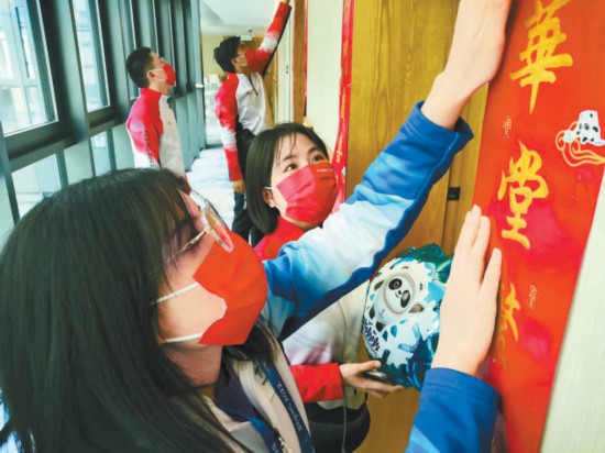 服務(wù)保障人員的村內(nèi)生活也趣味十足。下午3點(diǎn)多,一場(chǎng)“守海陀歲·延慶冬奧村新村民共贏未來(lái)”主題活動(dòng)在訪客中心舉行。“微笑的雪,為大地開(kāi)花;愛(ài)灑向手心,純潔無(wú)瑕……”中外志愿者們用12種語(yǔ)言唱起北京冬奧會(huì)志愿者之歌《燃燒的雪花》,擊鼓傳花,匿名交換明信片,現(xiàn)場(chǎng)溫馨又熱鬧。而在媒體中心,志愿者寫(xiě)福字,貼福字,迎接春節(jié)和冬奧的到來(lái)。晚上6點(diǎn)多,延慶冬奧村還迎來(lái)了“志愿者虎年春節(jié)聯(lián)歡晚會(huì)”,志愿者各顯身手帶來(lái)彈唱、傳統(tǒng)曲藝、芭蕾舞表演等節(jié)目,以“線上村晚”開(kāi)啟新的一年。