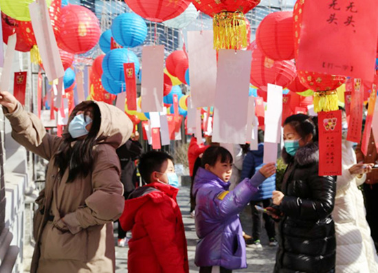 在百年建筑九如樓前的花燈廣場(chǎng),200件掛有傳統(tǒng)燈謎的彩色宣紙燈籠與北京雪后藍(lán)天相映成趣,全天開放燈謎游戲供民眾互動(dòng)參與。