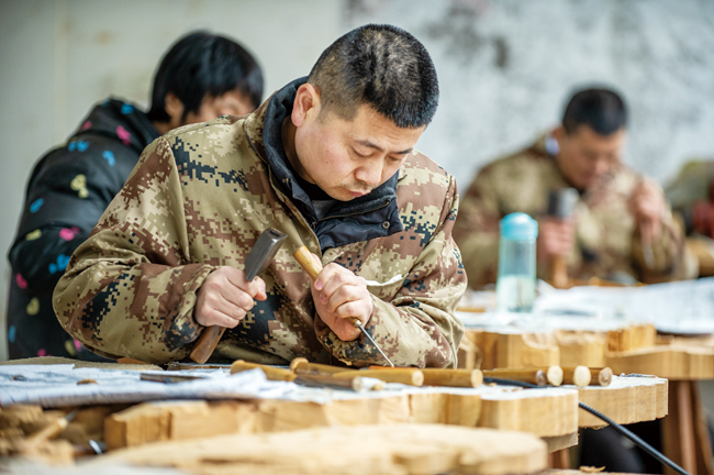 2月16日,金華東陽市一木雕工坊里,工匠在專心制作大型木雕作品。春節(jié)過后,東陽木雕企業(yè)紛紛開工生產(chǎn)趕訂單。(胡肖飛)