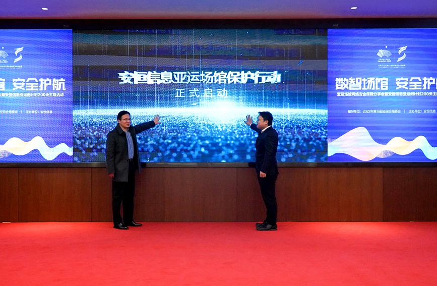 人民網(wǎng)杭州2月23日電 (張麗瑋)今天,杭州亞組委廣播電視和信息技術(shù)部副部長趙欣浩與安恒信息高級副總裁袁明坤共同啟動了“亞運場館網(wǎng)絡安全保護行動”。