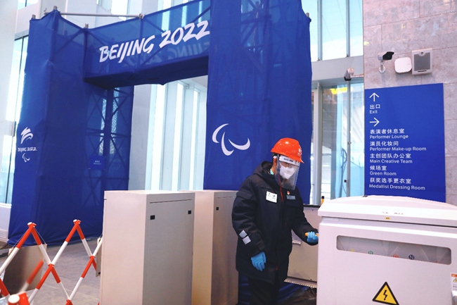 國網(wǎng)北京頒獎廣場電力保障團隊成員在延慶冬殘奧頒獎廣場巡視舞臺區(qū)設備,確保頒獎儀式供電可靠。張博寧攝