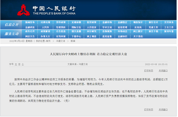 央行上繳萬億元結(jié)存利潤 專家:增大轉(zhuǎn)移支付惠企利民