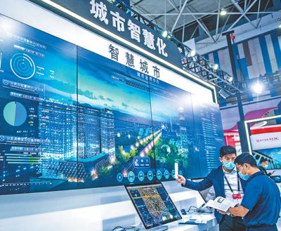 在貴州貴陽舉辦的中國國際大數(shù)據(jù)產(chǎn)業(yè)博覽會上,參會者了解智慧城市治理中心。