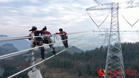 河北送變電公司高空作業(yè)人員認真開展架線施工。 王學(xué)恩攝