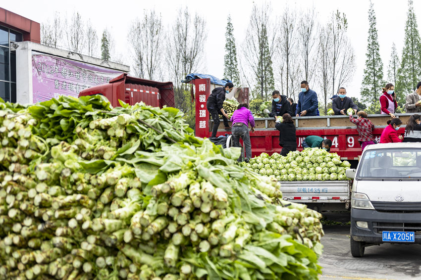 都江堰市民對蔬菜進行分揀、裝車。何勃攝