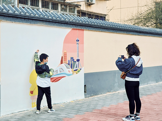 四歲的熱心市民“可樂”看著正在進(jìn)行墻體繪畫的工作人員贊嘆道,“可樂”的媽媽在旁邊開心地笑著。