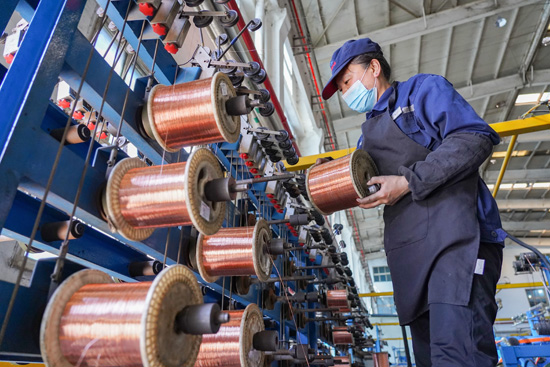 在河北省唐山市豐南區(qū)一家線纜制造企業(yè)生產(chǎn)車間內(nèi),機(jī)器設(shè)備正常運(yùn)行,工人在崗位有序生產(chǎn)。 李福政攝