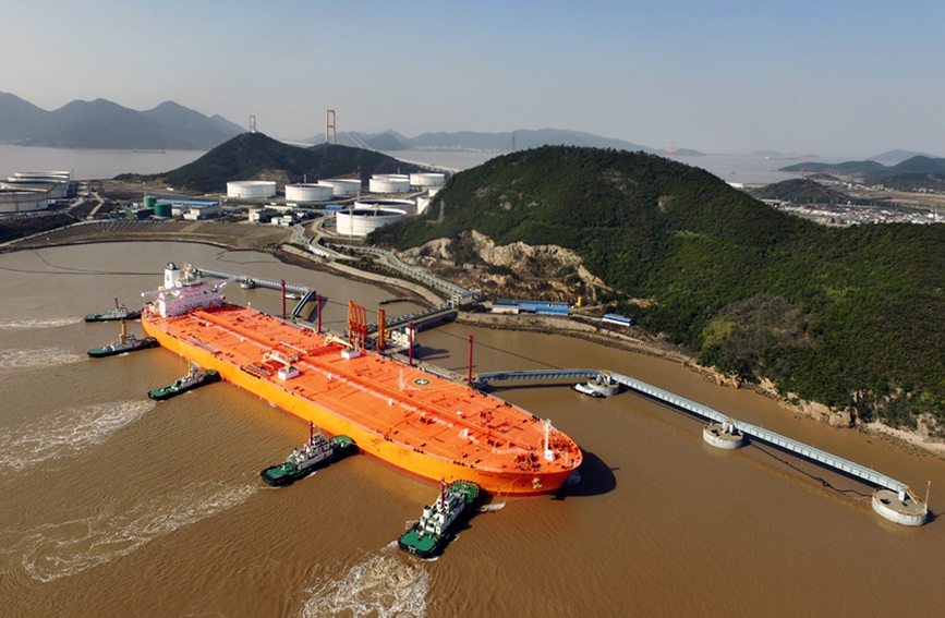 30萬噸巨型油輪靠泊岙山石油轉運基地。中國(浙江)自由貿易試驗區(qū)舟山管理委員會供圖