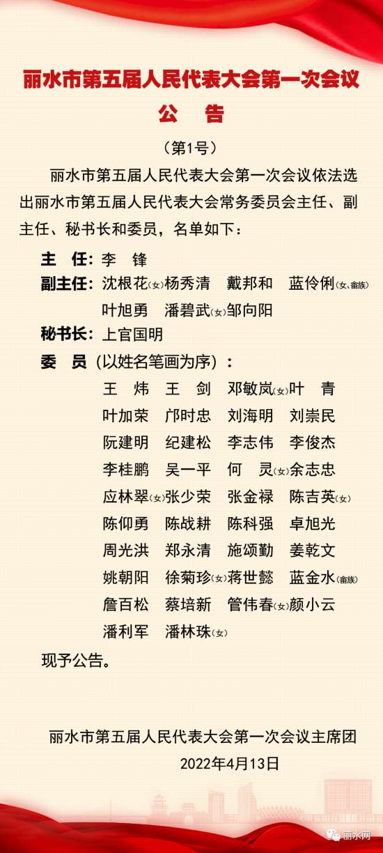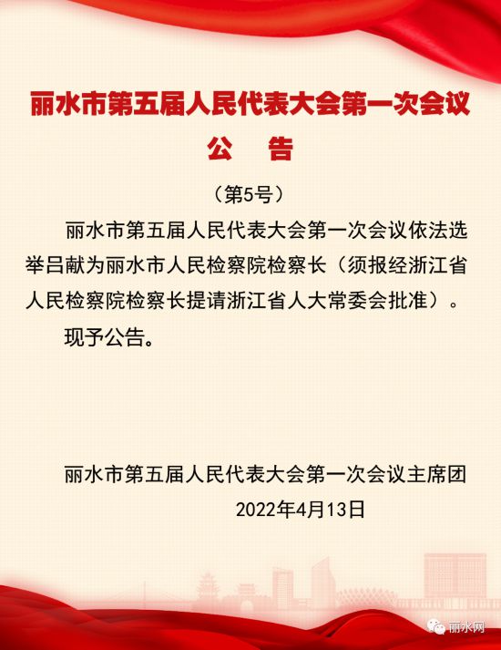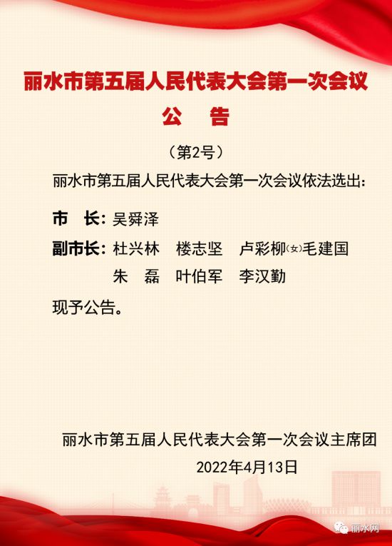 4月13日上午,麗水市五屆人大一次會議舉行第三次全體會議,選舉產生麗水市人大常委會主任、副主任、秘書長和委員,麗水市人民政府市長、副市長,麗水市監(jiān)察委員會主任,麗水市中級人民法院院長,麗水市人民檢察院檢察長。